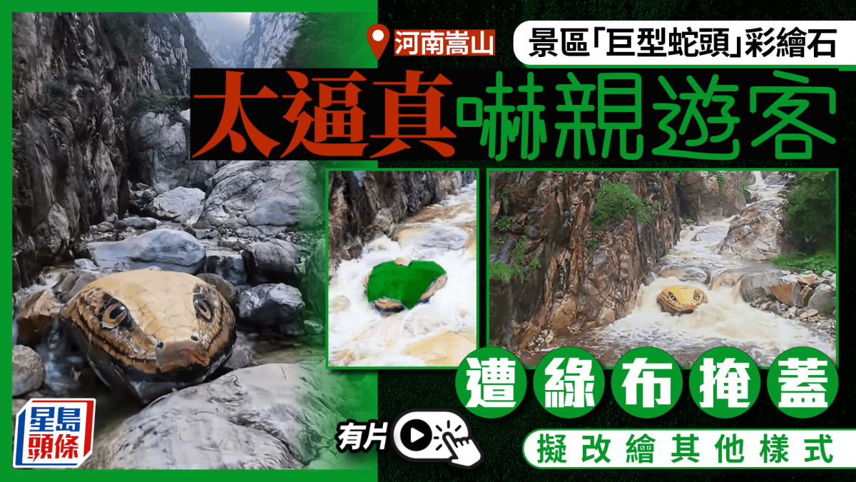 河南嵩山玉皇溝景區一「巨型蛇頭」因太逼真被指嚇人。9月20日,景區一名工作人員表示,近期接到遊客投訴,已將彩繪的石頭覆蓋,後期擬改繪其他樣式。網民意見兩極,有人表示嚇壞遊客予以支持,有人表示扼殺創意。