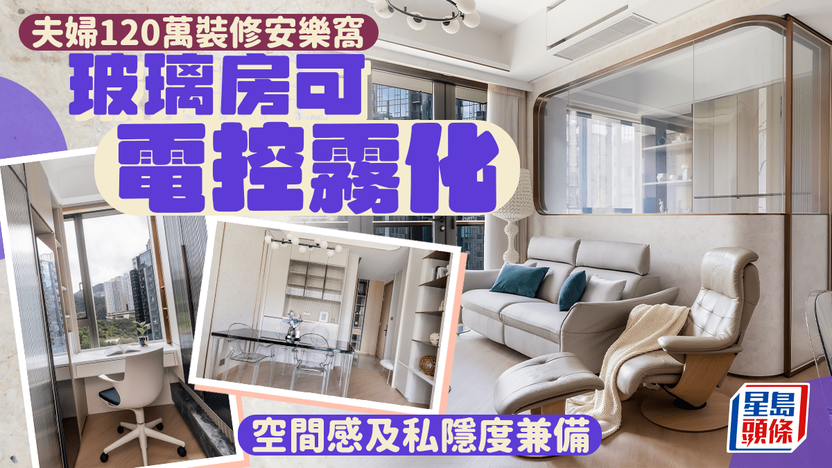 今次參觀沙田瓏珀山一個實用面積986呎的三房單位,戶主為一對夫婦,以120萬元裝修打造安樂窩。Hei Design設計團隊將原有的三房間隔重新規劃,以簡約輕奢現代風格為主調,將空置客房改成書房和衣帽間,實現戶主對設計細節和質感的要求。其中,書房設計特別,玻璃間隔可自行調節為透明或霧化效果,同時打造通透空間感及私密空間兩種形態。