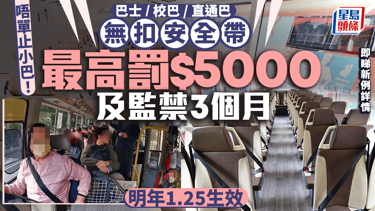 警方日前在東九龍派員放蛇搭小巴,至少發現31名乘客違規沒有配戴安全帶,遂向他們發出傳票。然而,原來不止小巴,根據政府早前修訂的《道路交通(安全裝備)規例》,2026年1月25日起,乘客如乘搭已配備安全帶的專營巴士、公共及私家巴士等,均須佩戴安全帶,違者可處罰款5,000元及監禁3個月。新修訂亦涵蓋校巴、旅遊巴及跨境直通巴等。