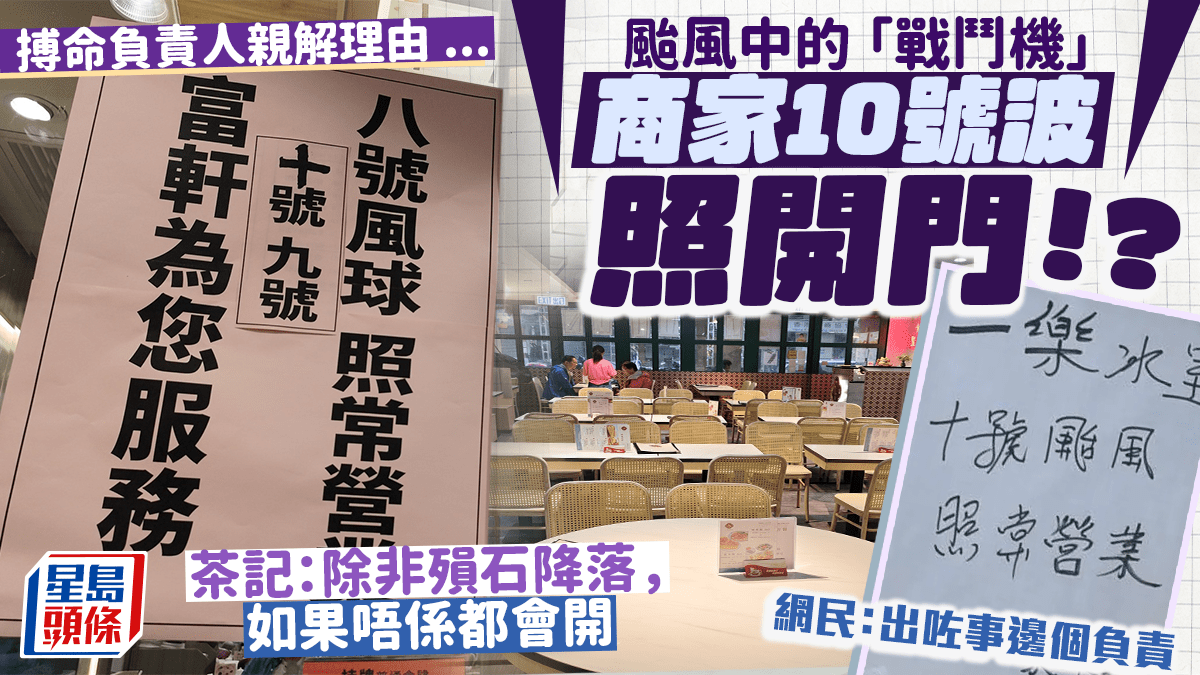 事緣,數名網民在社交平台分享本地店舖的「超前部署」安排,多間餐廳提前宣布,即使天文台在未來一兩天改發十號颱風信號,仍會照常營業,為街坊服務。當中更有不少茶餐廳、酒樓及咖啡店,他們早已貼上告示,表明會「十號颱風,照常營業」。在紅磡有冰室負責人更在Facebook發帖,揚言「除非隕石降落香港,如果唔係都會開」,並承諾絕對不會加價,「就好似踢波咁風雨不改」。據了解,餐廳希望透過堅守崗位,為附近居民提供便利,特別是那些因颱風無法外出的市民,店員更向記者強調「火星撞地球都會開門」。