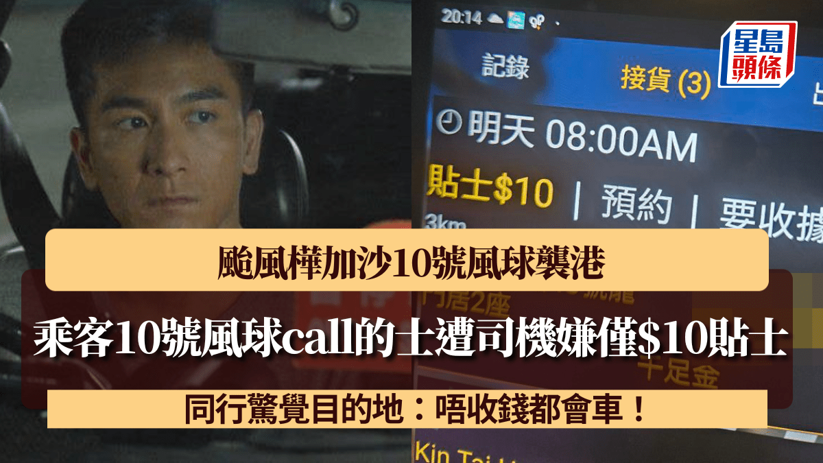 超強颱風樺加沙於周二深夜(23日)強勢襲港,香港天氣急速轉壞,周三(24日)凌晨甚至發出10號風球,本港廣泛地區受到超強列風吹襲。不過,其實在超強颱風下仍有不同行業需要緊守崗位,有的士司機於網上群組分享,表示有乘客透過電召的士App預約的士並給予$10貼士。惟該司機嫌棄乘客「出手低」只得$10,並嘲諷:「1蚊1個級風球,多謝你呀」,帖文引起網民熱議及批評。