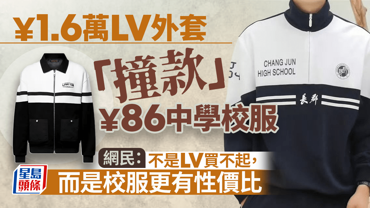 LV官網顯示,這款售價1.6萬元(人民幣‧下同)的外套配色和紋理跟售價86元的長沙市長郡中學的校服頗為相似,兩者均以上半部份白、下半部份黑為基礎色,而且都有黑色領口。有畢業於該校的網友評論道:「四捨五入,我媽媽當年是丟掉了多少奢侈品?」