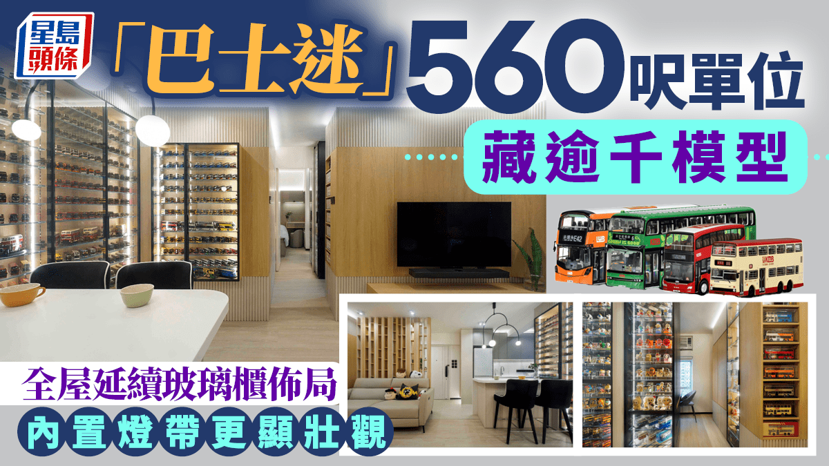 參觀青衣翠怡花園一個實用面積560方呎的的三房單位,屋主為一對夫婦,男主人是位「巴士迷」,擁有逾千架巴士模型,女戶主則喜愛Snoopy及潮玩。為了能在家居中展示所有擺件,他們找來Viz Design設計及耗資85萬元,打造了一間以潮玩模型為主要元素的安樂窩。