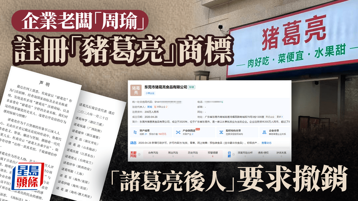 「豬葛亮」食品店老闆名「周瑜」 諸葛亮後人要求撤銷註冊