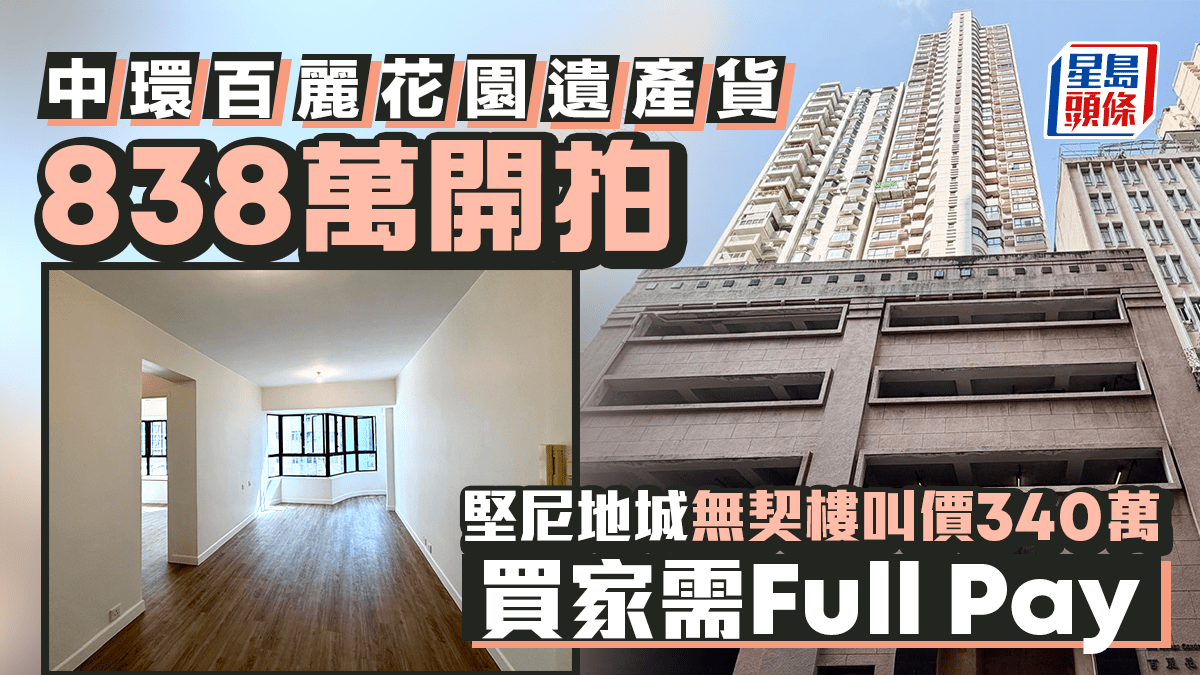 中環百麗花園遺產貨838萬開拍 堅尼地城無契樓叫價340萬 買家需Full Pay