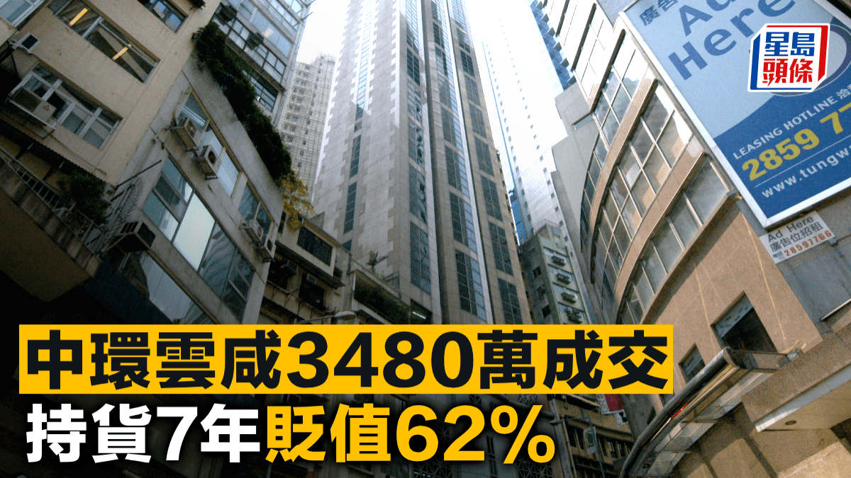 商廈交投持續,中環雲咸商業中心18樓全層,建築面積約3480方呎,以每呎約1萬易手,涉資約3480萬,原業主於2018年10月以9146萬「摸頂」購入物業,持貨7年帳面虧損5666萬,物業貶值62%。