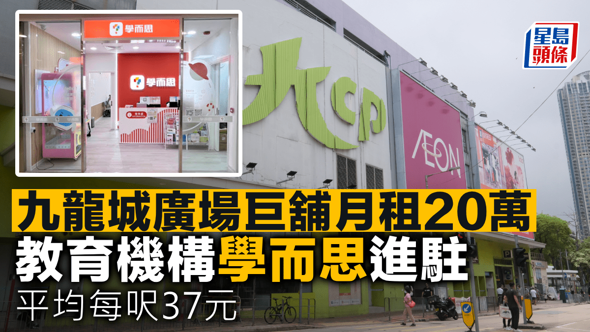 香港發展成為國際的教育樞紐,造就教育機構對物業需求殷切,九龍城廣場一個巨舖,面積約5,467方呎,舊租客食肆約滿撤出後,巨舖由美國上市公司旗下教育機構「學而思」承租,每月20萬,與舊租金一樣,平均每呎37元。
