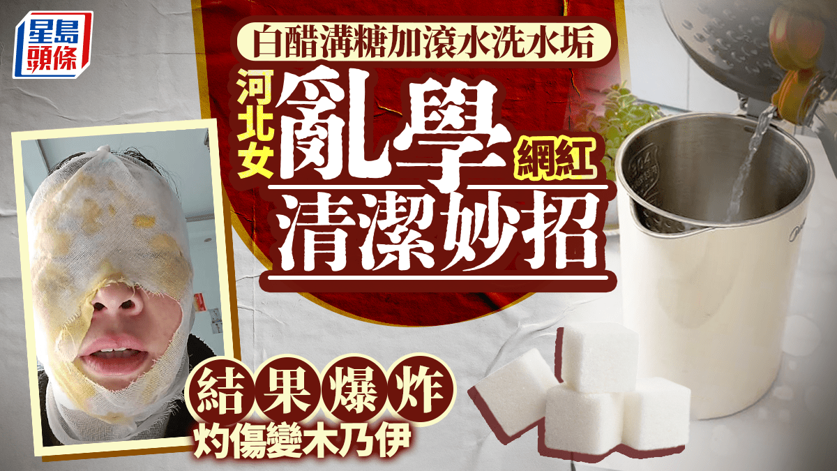河北有女子在網上學來生活妙招,用白醋溝糖加滾水來為保溫杯洗水垢,卻發生爆炸,導致滿臉被燙傷,包紥成木乃伊一樣。