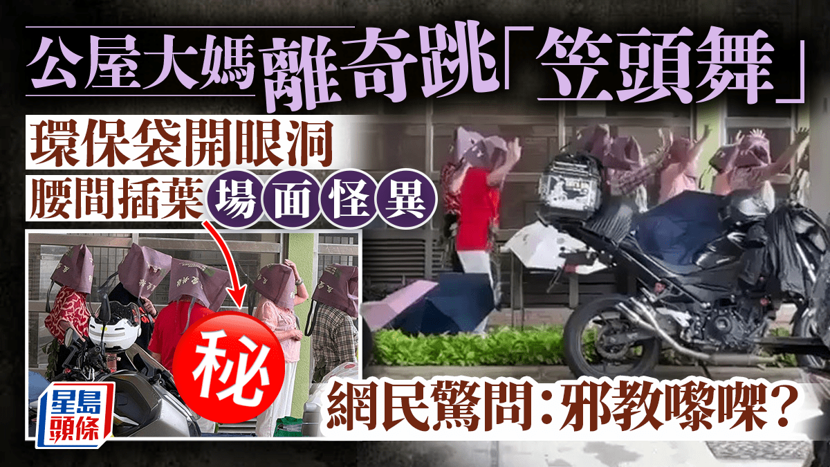 一群公屋大媽早前在街頭當眾離奇大跳「笠頭舞」,頭部套著的環保袋開了眼洞,各人腰間插葉,由於場面怪異,嚇得網民驚問「邪教嚟㗎?」。詳情見下圖及下文: