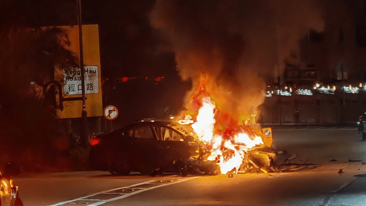 大圍私家車越線猛撼Tesla 車頭陷火海變廢鐵 兩司機送院
