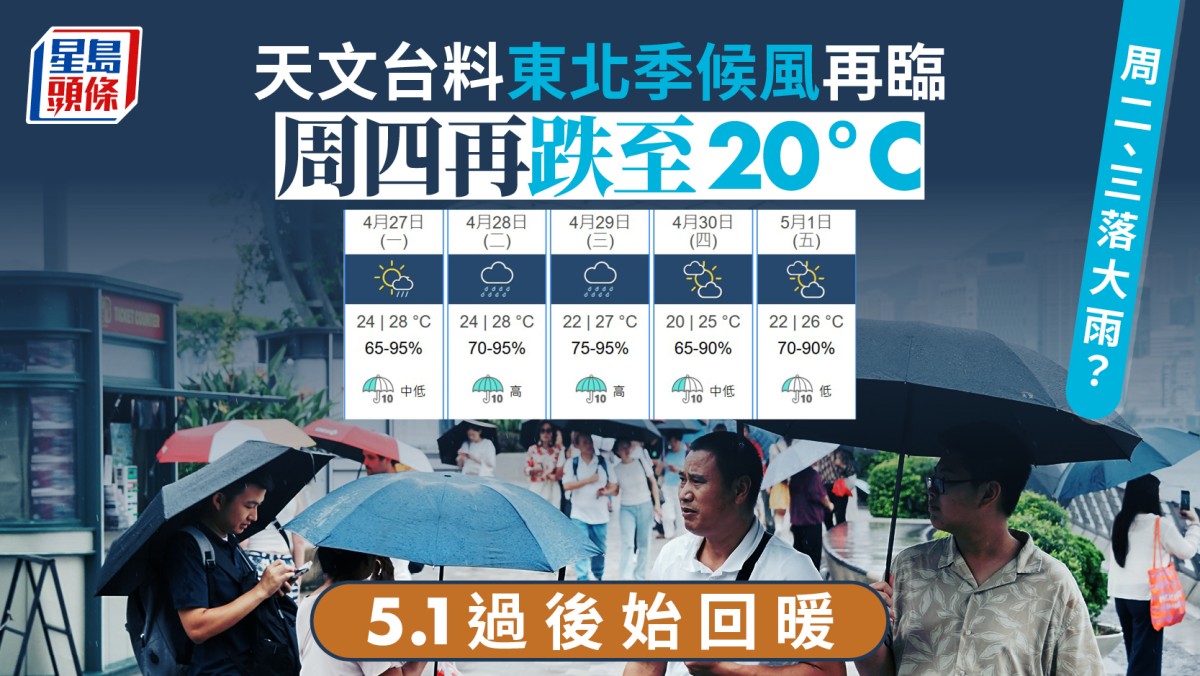 天文台︱周二、三落大雨?東北季候風再臨 本周後期再度降溫至20°C 5.1後始回暖