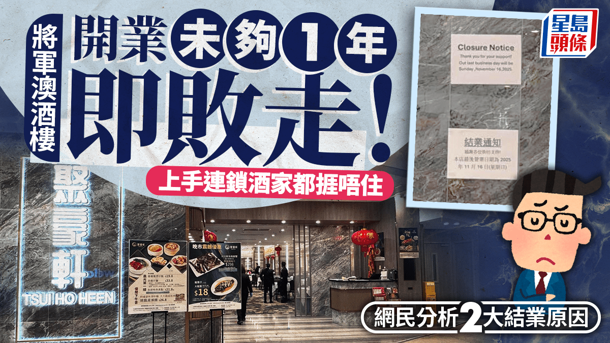 將軍澳酒樓開業不足一年突結業!上手連鎖酒家同樣敗走 網民分析2大執笠原因