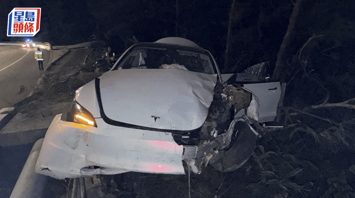 屯門Tesla自炒鏟上草叢 女司機受困由救防救出 座駕損毀如廢鐵