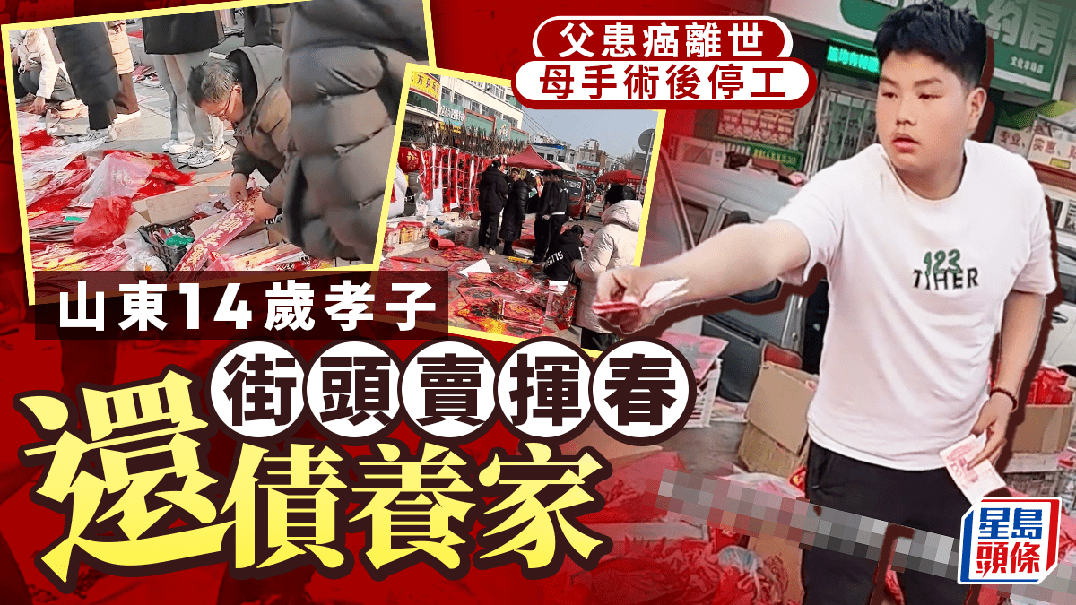 農曆新年,大部份人都與親友歡度佳節,但山東招遠14歲考順男「小高」,卻幫父母還債,於街頭擺攤賣每張0.5元(人民幣)的揮春,小高的同學更在現場幫手、市民紛紛出手支持,甚至有有心人多付款,但小高卻堅持拒收,亦有網紅下了一萬元的訂單。事件曝光後,在網絡掀起關注。 「極目新聞」報道,周二(17日),小高的母親徐女士表示,2024年,丈夫因癌症離世,家中只剩下自己、一對龍鳳胎兒女和81歲的老爺共同生活。平