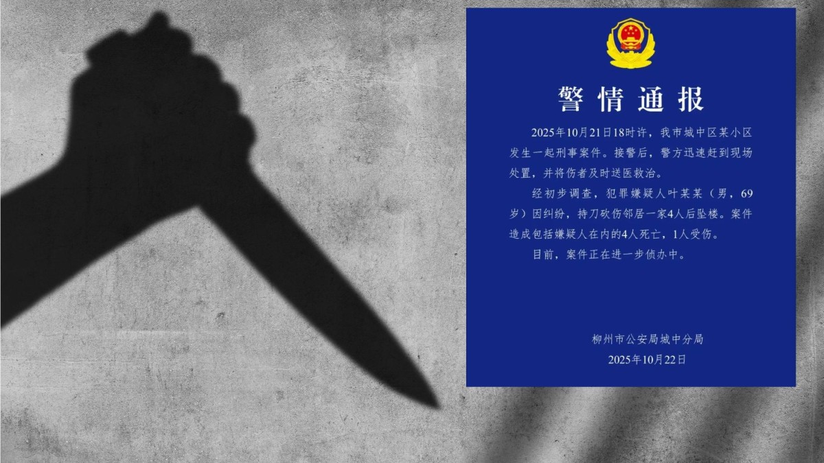 當地警方通報,事發在周二(21日)傍晚6時許,地點在柳州市城中區某小區。69歲葉姓男疑犯因糾紛,持刀斬傷鄰居一家4人後墮樓。案件造成包括疑犯在內的4人死亡,1人受傷,傷者已及時送醫救治。目前,案件正在進一步偵辦中。