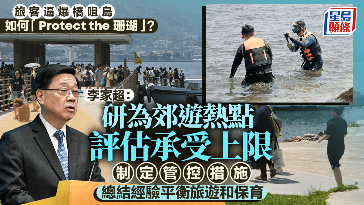 國慶黃金周首日,有遊客在西貢橋咀洲觀光時,從海中捕取海洋生物、踐踏珊瑚,並在沙灘上生火煮食,引起社會和環保團體關注,漁護署其後亦派員上島呼籲遊人,提醒要「Protect the 珊瑚」。李家超今早(14日)行會前見記者回應提問時表示,相關部門正研究為熱門郊遊地點,評估承受上限,制定相應管控措施加強管理,也會檢視不同地點的交通安排、作長遠規劃。李家超強調,政府會總結經驗,做好旅遊和保育的平衡。