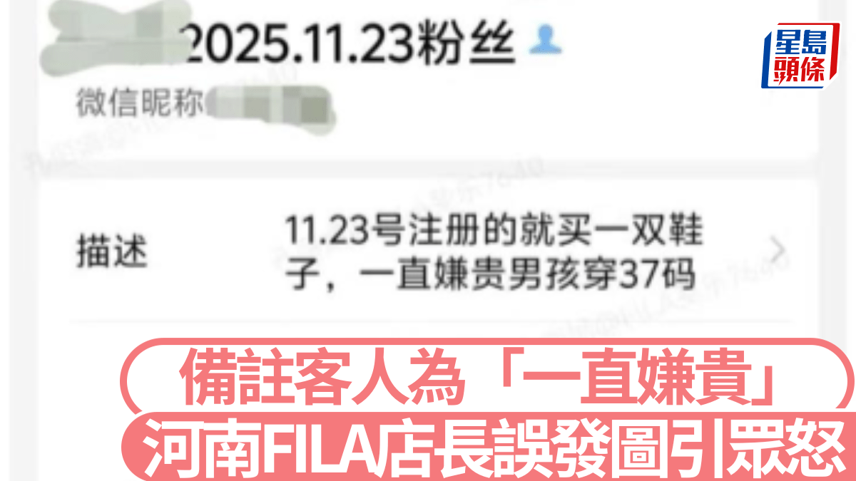 河南FILA店長備註顧客「買雙鞋子都嫌貴」 截圖錯發粉絲群引眾怒