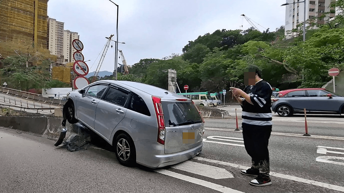 清水灣道私家車撞分隔石壆 車頭擱起路牌被撞毀