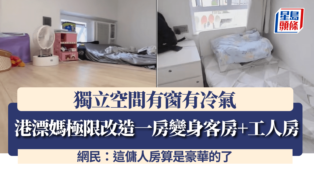 香港出名地少人多,住房空間有限,不少人都會花盡心思改造自己的蝸居,務求將有限空間用到最盡。近日,有港漂媽分享如何將1間房變成工人房及客房,兩者均能做到「有門有窗有空調有儲物空間有隱私」,形容是「各自其職」。不少網民對於這改造評價不俗,表示「這傭人房算是豪華的了」,亦有人認為空間太少感覺頗為壓抑,詳情即看下文!