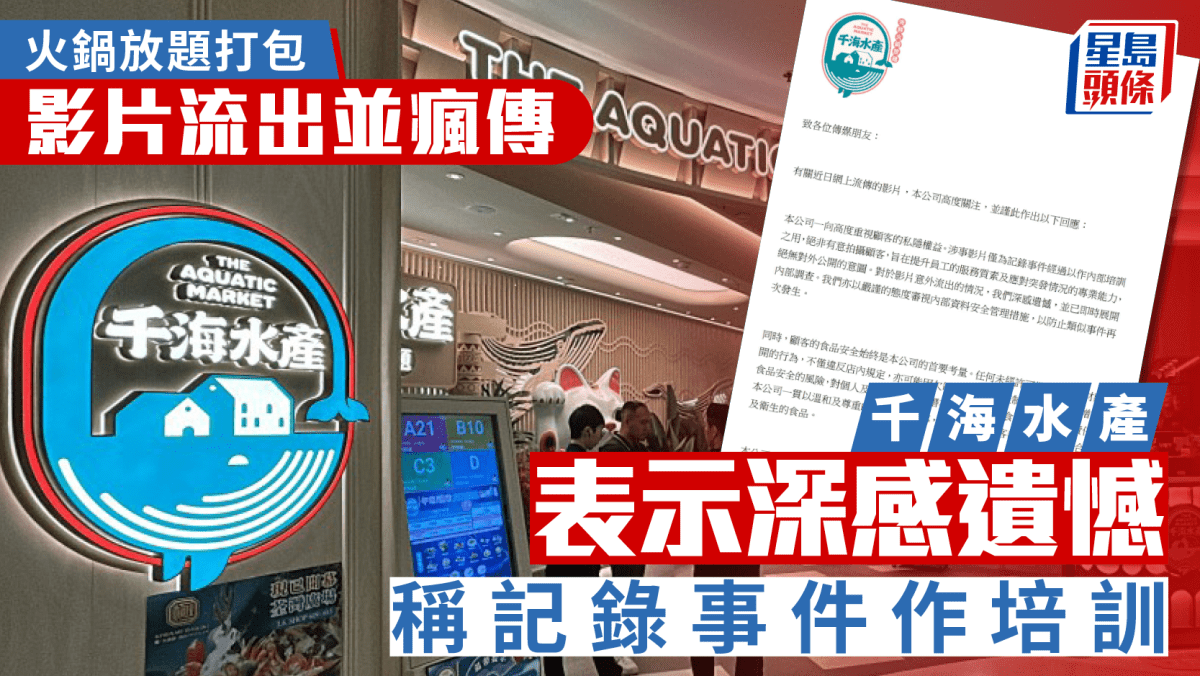 千海水產今(28日)下午回應事件,指該公司高度關注,發言人表示,該公司一向高度重視顧客的私隱權益。涉事影片僅為記錄事件經過以作內部培訓之用,絕非有意拍攝顧客,旨在提升員工的服務質素及應對突發情況的專業能力,絕無對外公開的意圖。對於影片意外流出的情況,公司深感遺憾,並已即時展開內部調查。該公司亦正以嚴謹的態度審視內部資料安全管理措施,以防止類似事件再次發生。