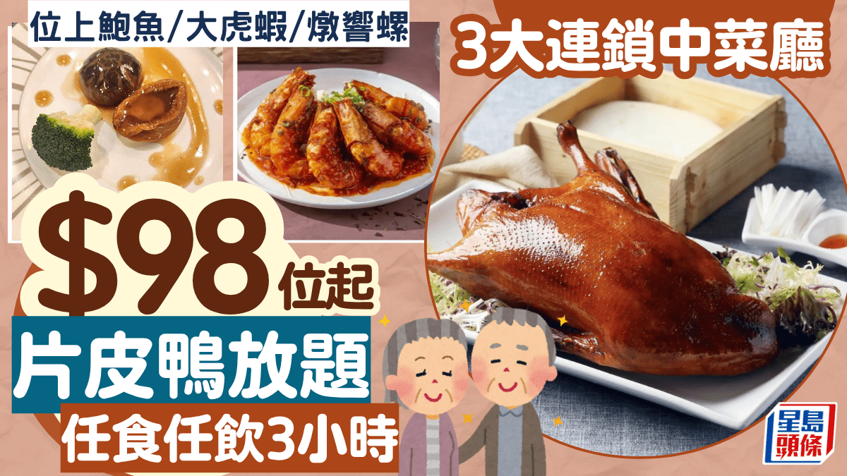 片皮鴨放題劈價$98/位!雲海匯/囍慶任食3小時每位加送6頭鮑魚/大虎蝦/燉響螺 無限任飲紅白酒