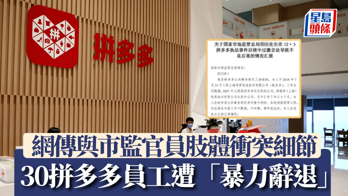 網傳拼多多30員工遭「暴力辭退」 信函爆與市監官員肢體衝突細節