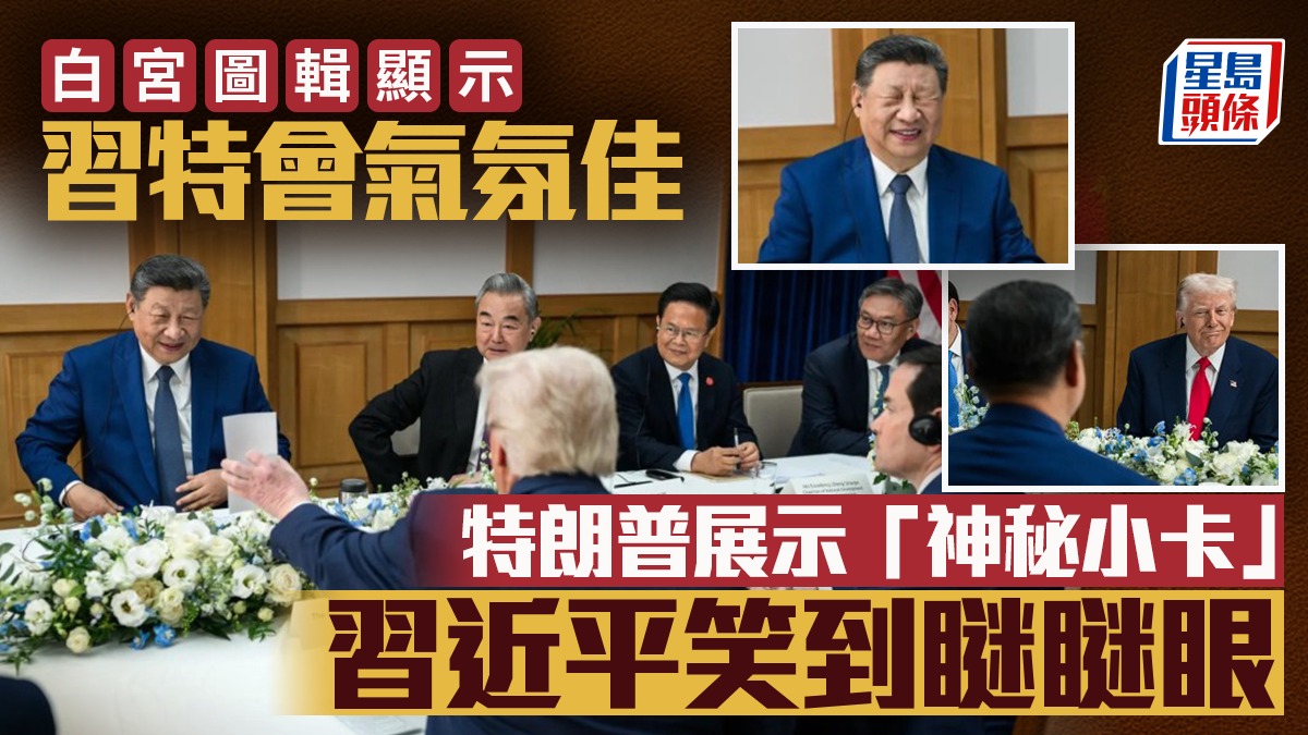 照片中,特朗普伸出手臂,向習近平展示一張不知內容為何的小卡。習近平很好奇,似乎想伸手接過來看,攝影師還拍下習近平笑出「瞇瞇眼表情包」的一刻。