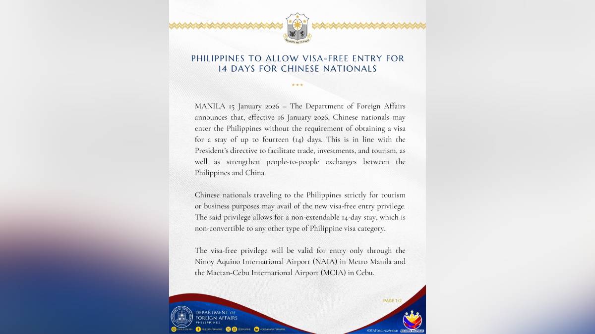 菲律賓外交部:16日起予中國公民免簽待遇 最多停留14日