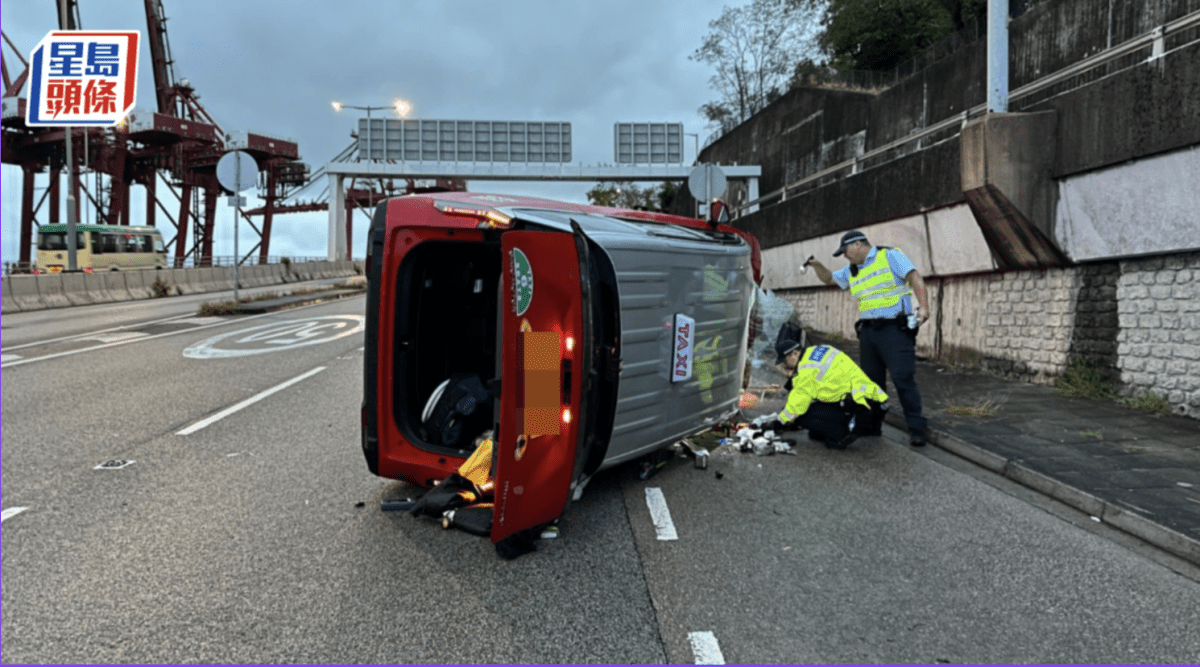 葵青路的士疑揀錯路口 撞中間分隔壆翻側 車毀人輕傷