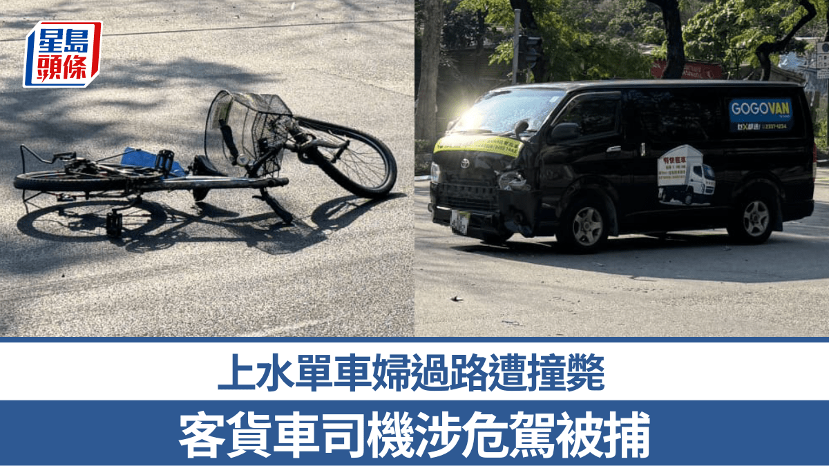 今(18日)晨8時許,一輛客貨車沿上水馬適路往粉嶺方向行駛,至皇府山屋苑附近時,一名姓曹(55歲)女子踏單車駛出,客貨車收掣不及,將她撞倒,曹女人車分離,撲地倒下昏迷不醒,頭部重創,救護員接報到場,將她送院搶救,惜告不治。 網上片段顯示,死者踏單車橫過馬路,一輛客貨車高速馳至將她撞倒,死者整個人彈飛數米。警方在場調查後,53歲客貨車司機涉嫌危險駕駛引致他人死亡被捕,現正被扣留調查。新界北總區交通部