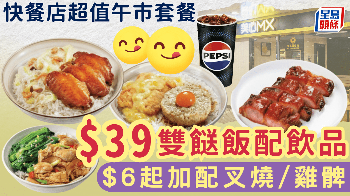 連鎖快餐店午市套餐優惠 雙餸飯$39連飲品 $6起加配叉燒/雞髀
