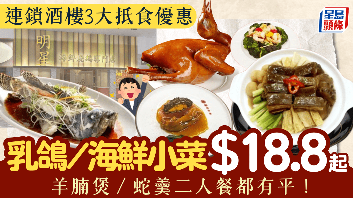 連鎖酒樓3大優惠!乳鴿/海鮮小菜$18.8起 羊腩煲/蛇羹二人餐都有平