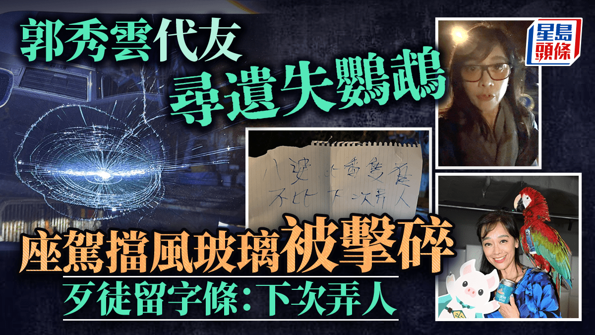 郭秀雲元朗代友尋遺失鸚鵡 座駕擋風玻璃被擊碎 兇徒留字條:下次弄人