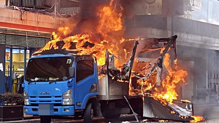 今(2日)午2時28分,銅鑼灣百德新街油站對開一輛貨車起火,火勢猛烈,濃煙席捲半空,多名途人報警。消防到場開喉將火撲熄,事件中無人受傷。