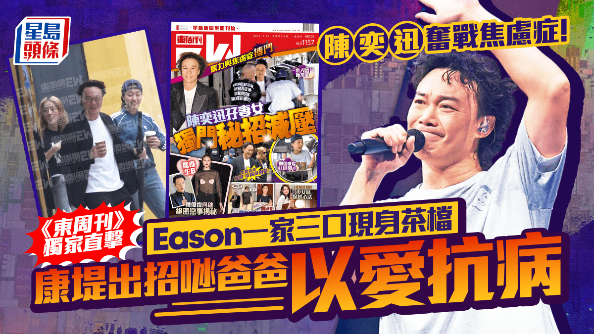 現年51歲的陳奕迅(Eason)今年8月於他的演唱會紀錄電影《FEAR and DREAMS: NOW is the only reality》中首度公開自己患上焦慮症,早前他接受鄭裕玲YouTube頻道訪問時,表示巡迴演唱會結束後,目前病情已有好轉,但未能停藥。最新一期《東周刊》直擊Eason享受天倫樂,一家三口現身大坑貼地歎茶檔,全程有講有笑,用愛奮戰焦慮症。