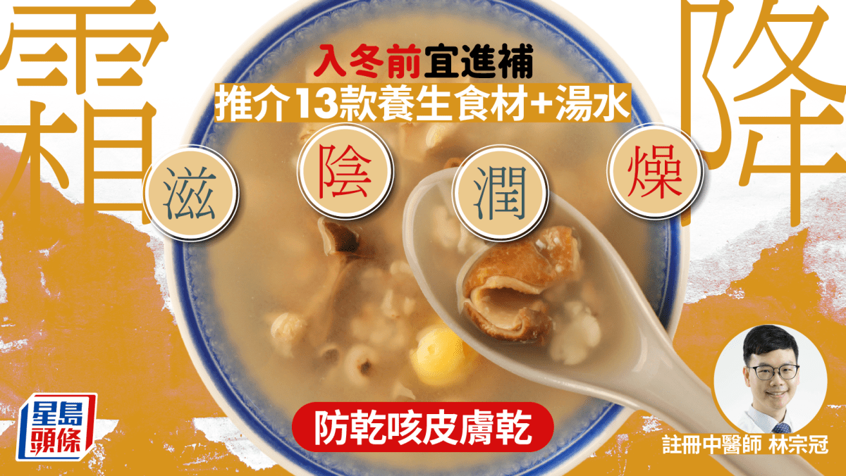 【霜降節氣2025】霜降是秋天最後一個節氣,入冬前香港天氣仍然較熱?註冊中醫師林宗冠接受《星島頭條》訪問指,此時已可以開始進補為冬天做好準備,他推介10款「平補」食材,且教煲3款滋陰潤燥的湯水,潤肺健脾,紓緩乾燥。