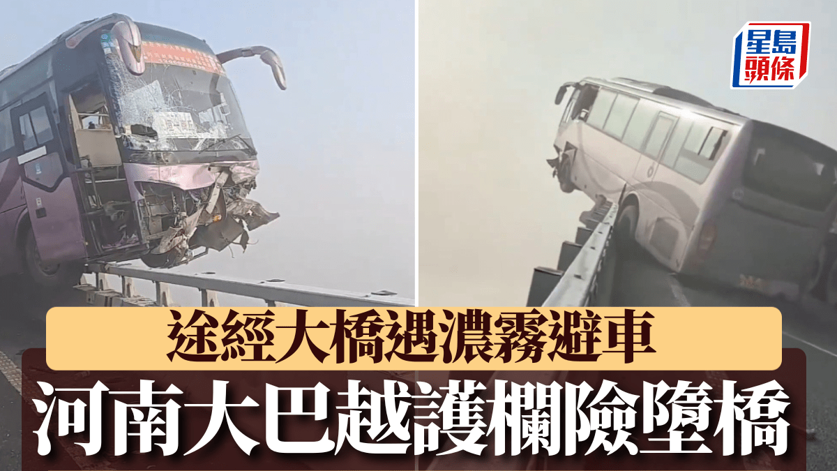 霧鎖大橋︱河南大巴避車扭軚 車頭越護欄「半天吊」︱有片