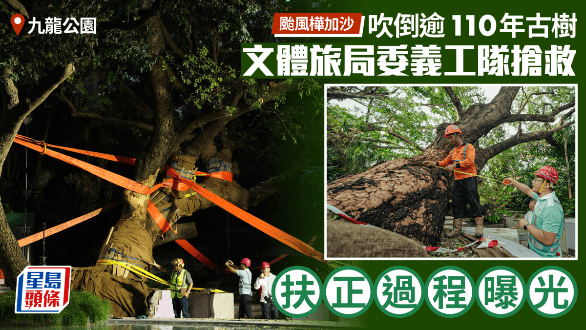 超強颱風「樺加沙」9月底襲港,九龍公園一棵樹齡逾110年的大葉合歡古樹傾倒,岌岌可危,事件引起港人以至內地民眾關切。當局委託中國建築義工隊協助,出動重型機械搶救傾覆的古樹,今天嘗試把古樹扶正,過程中發現其樹幹中空,恐拉吊期間令樹體截斷,令營救行動出現變數,幾經努力,至今晚終把樹身扶正近90度,交康文署護養,給古樹重生機會。
