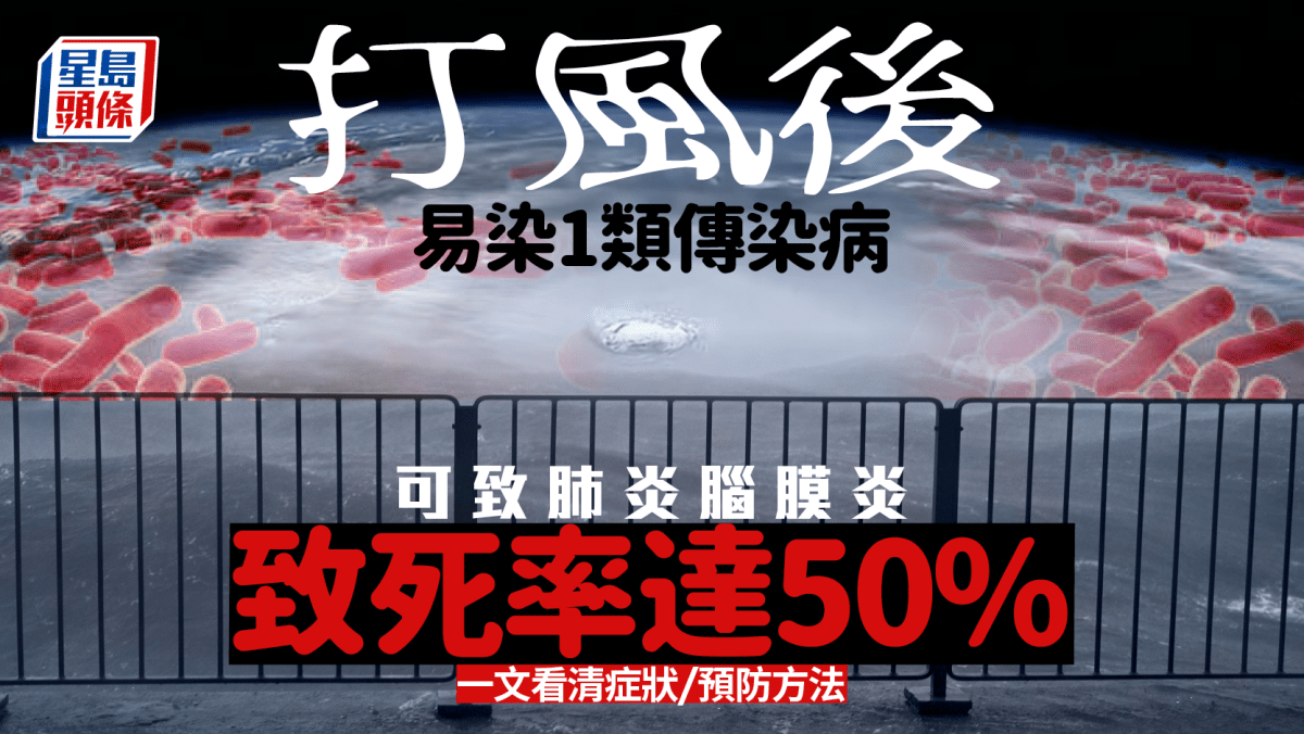 【颱風樺加沙】打風不宜出門,除了容易意外受傷,原來也會增加感染傳染病的風險。本港衞生防護中心昨日(23日)提醒,在颱風或惡劣天氣後易染1類傳染病,可致腦膜炎、肺炎等嚴重併發症,致死率更高達50%,呼籲市民做好預防措施。