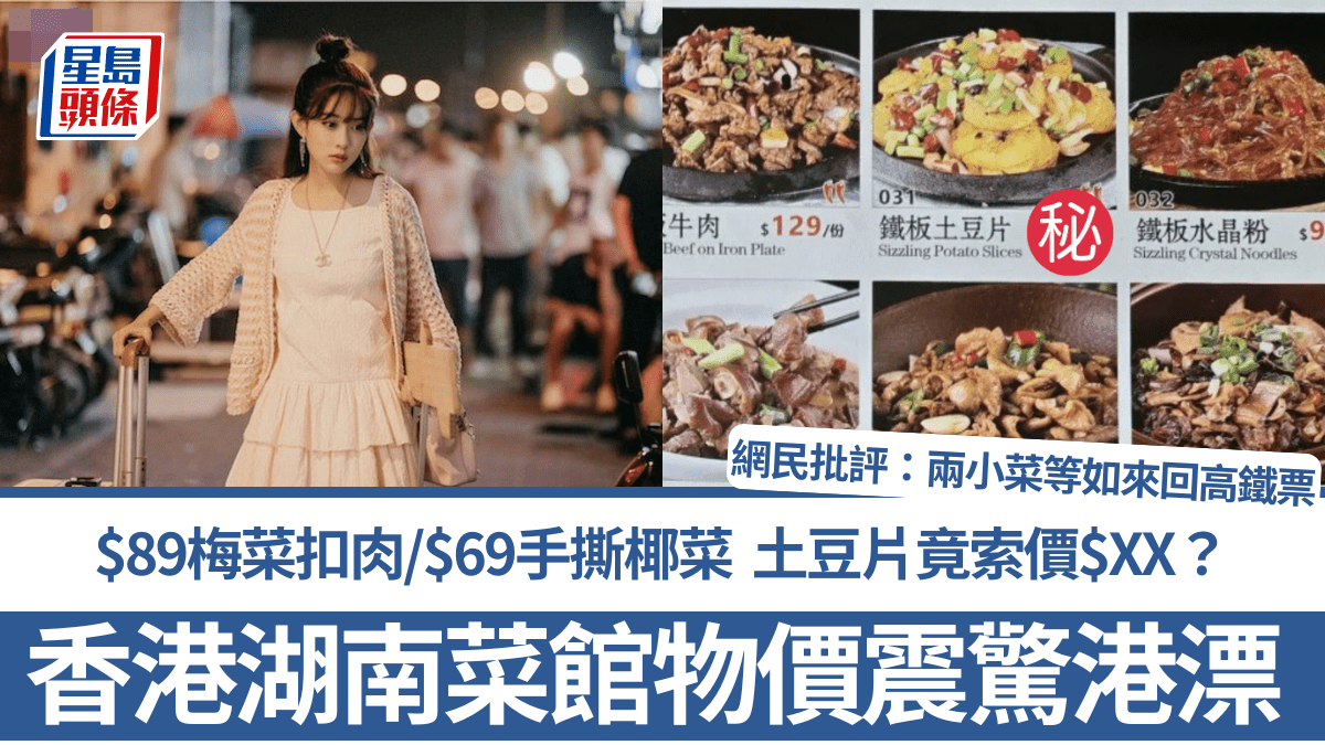 香港湖南菜館物價震驚老港漂!$89梅菜扣肉/$69手撕椰菜 土豆片竟索價$XX?網民批進取:兩小菜等如來回高鐵票