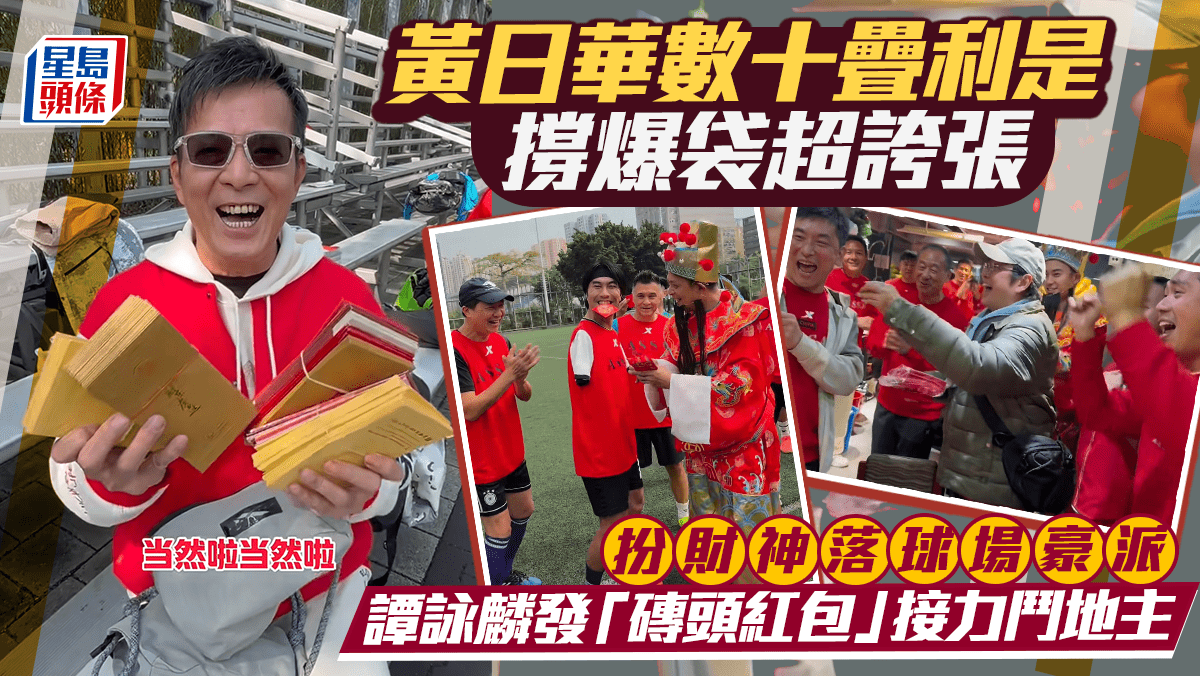 黃日華數十疊利是撐爆巨型袋超誇張 黐長鬚變財神落球場豪派 譚詠麟發「磚頭紅包」接力鬥地主