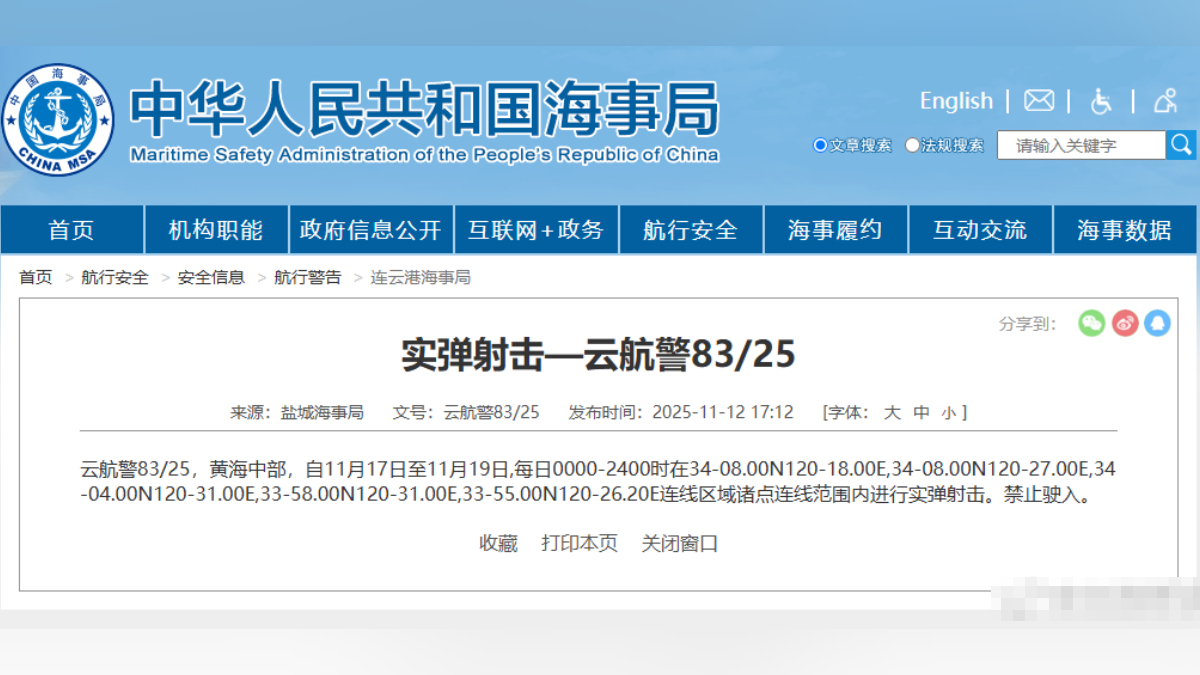 黃海中部周一至三實彈射擊 海事局禁船隻駛入
