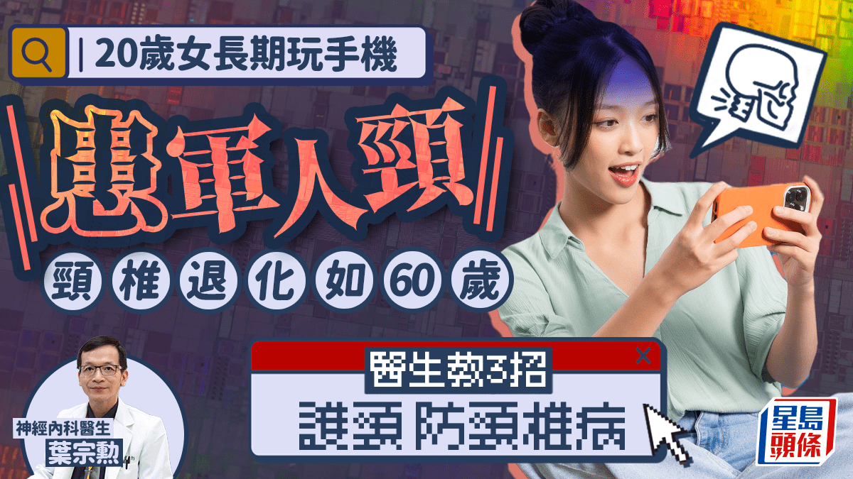 長時間低頭滑手機會引起頸部和上背部緊繃疼痛,也導致頸椎病。一名20歲女子長期低頭玩手機,出現頸部僵硬、更患上「軍人頸」,頸椎急速退化如60歲。到底有何方法可改善「軍人頸」?醫生教3招護頸兼防頸椎病,必做1個動作10秒立即見效!