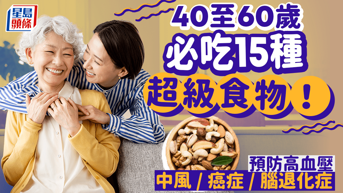 40歲、50歲及60歲以上人士,宜吃甚麼食物保健養生,以防「無聲殺手」?年紀漸長,要多吃果仁?有營養師提醒,不同年齡或性別的人士,身體出現的變化不同,需要攝取的營養也不同。她推介15種超級食物,適合3大年齡層人士,以預防常見的高血壓、中風、癌症、腦退化症等問題。