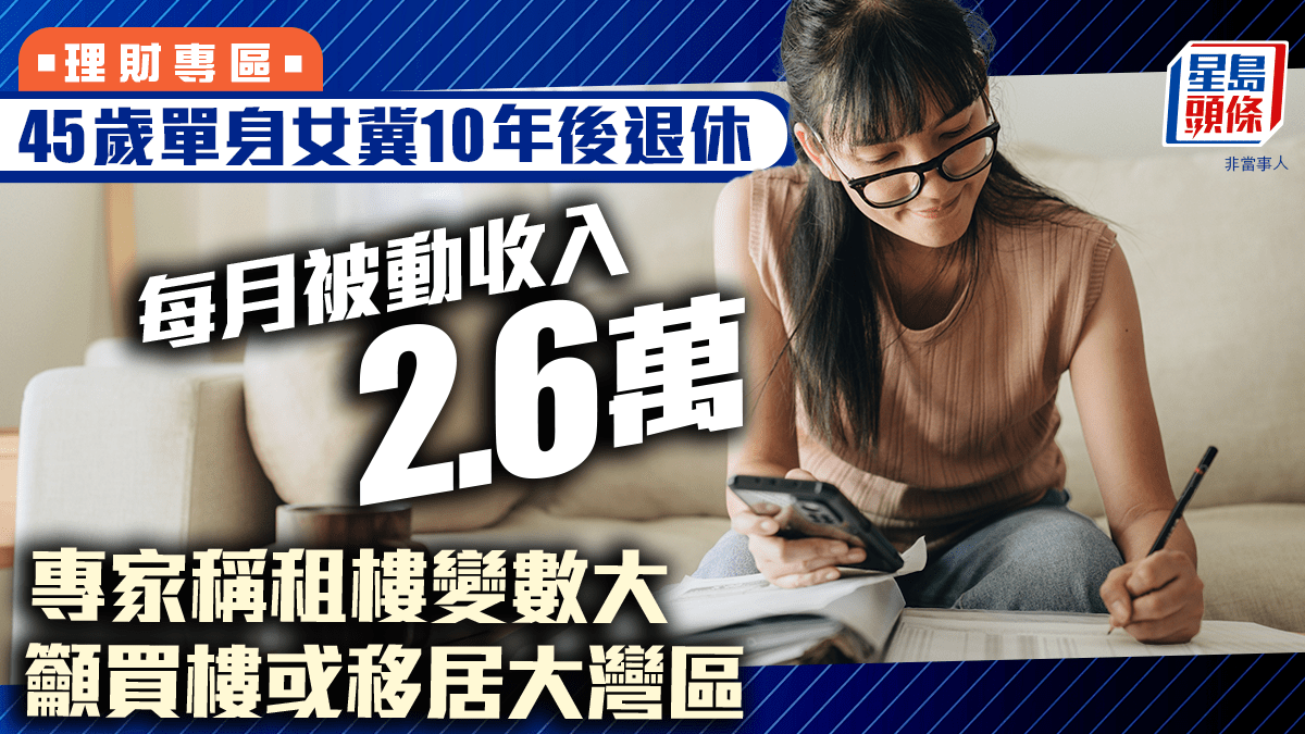 45歲單身女冀10年後退休 每月被動收入2.6萬 專家稱租樓變數大 籲買樓或移居大灣區