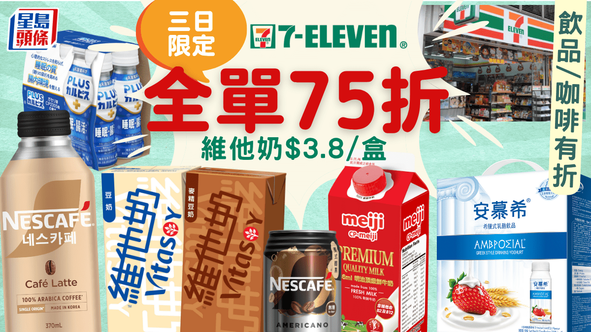 即日起至10月25日,只要於全港任何一間7-Eleven門市選購指定高蛋白飲品、鮮牛奶、牛奶飲品、豆漿豆奶、乳酪、乳酪飲品及咖啡(不包括7CAFÉ),滿$100即可享75折優惠。重點推介維他奶豆奶330毫升(各款)折實價平均每盒$3.8;雀巢咖啡250毫升罐裝(各款)折實價平均每罐$5.6;明治頂級鮮牛奶946毫升折實價平均每盒$19.5!