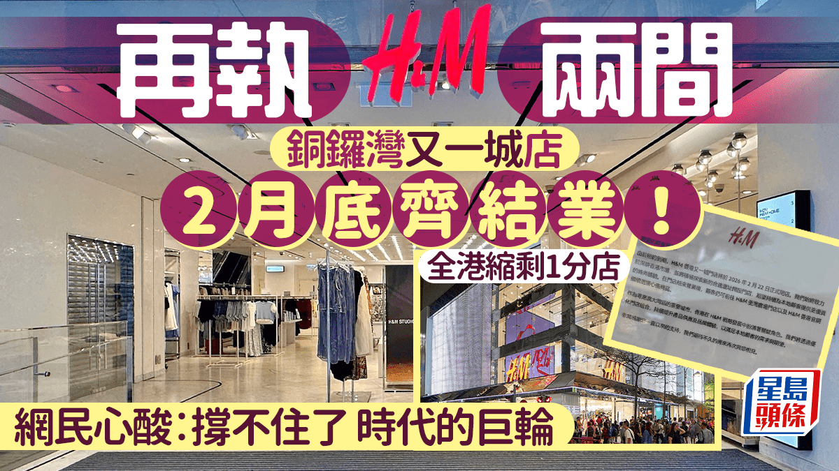 H&M再執兩間店!又一城/銅鑼灣旗艦店2月底齊結業 全港僅剩1分店 網民心酸︰撐不住了 時代的巨輪